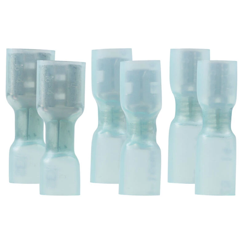 These kits each include six female adhesive-lined heat shrink disconnects: two .250 tabs, two .188 tabs and two .110 tabs. Ancor’s heat shrink terminals include a heat-activated adhesive built into the sleeve of the heat shrink tubing. When heated, they form a watertight seal between the terminal and the wire you are connected to and provide excellent vibration and strain relief.