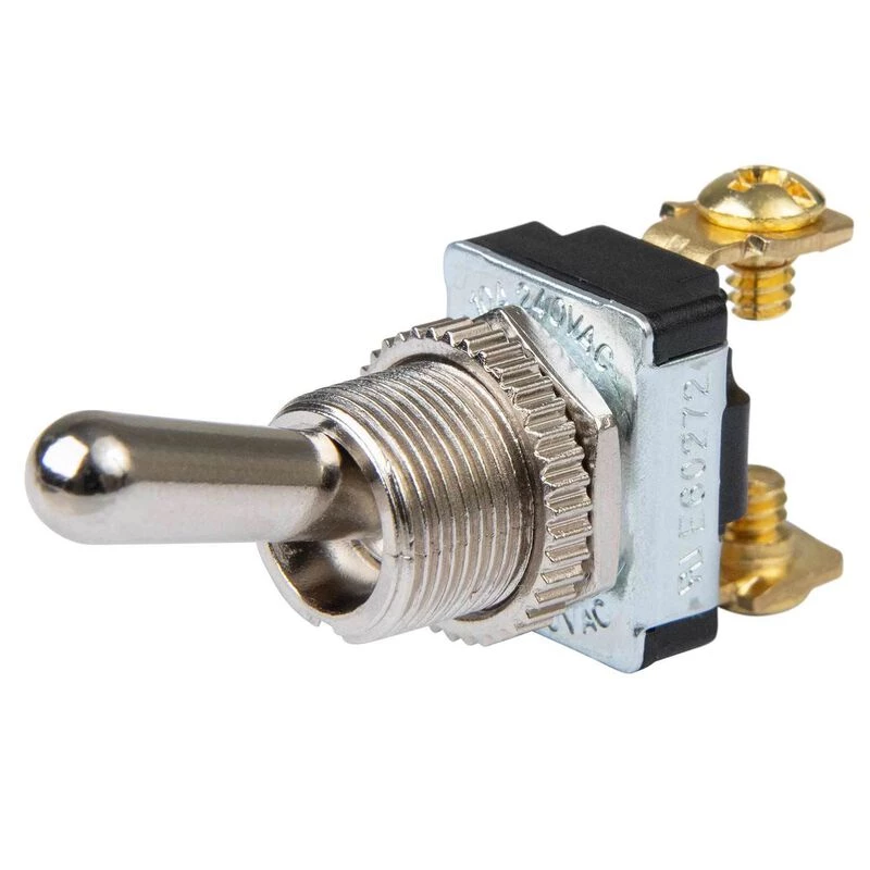 Single pole, single throw toggle switch turns one circuit on and off. Common applications include any single circuit requiring an on-off style switch. Nominal voltage is 12V DC. Rated for 10A @ 12V DC. 11/16″ handle and two #6-32 screw terminals. Mounting stem 15/32″ fits panels up to 1/4″ thick. Replaces Cole Hersee part number M-484.