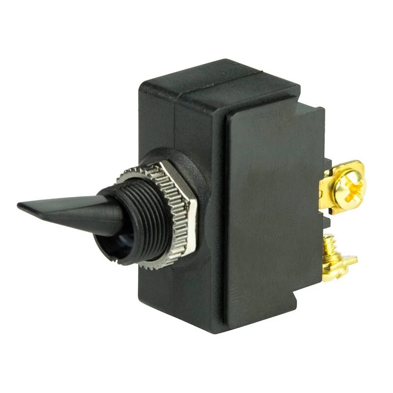 Single pole, single throw toggle switch turns one circuit on and off. Standard black nylon handle. Nominal voltage is 12V DC. Rated for 25A @ 12V DC. Two #6-32 screw terminals. Mounting stem 15/32″ fits panels up to 1/8″ thick. Replaces Cole Hersee part number 54100.