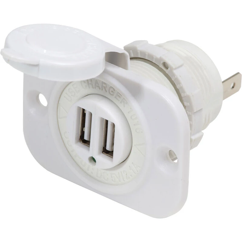 Wouldn’t a smartphone or tablet charger be more practical than a 12V outlet? Blue Sea Systems has designed this fast charge USB charger socket to fit where that outlet you haven’t used in years sits. Just remove the existing outlet, replace as necessary the connectors and fit the new outlet into the dash or bulkhead. This USB charger recognizes the needs of your device and charges it as necessary and provides two USB sockets to connect devices. An attached dust cover keeps out dust and moisture while not in use. The white panel blends into Make better use of the space at your helm by installing a practical USB charger.