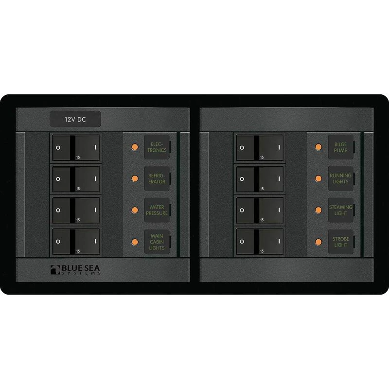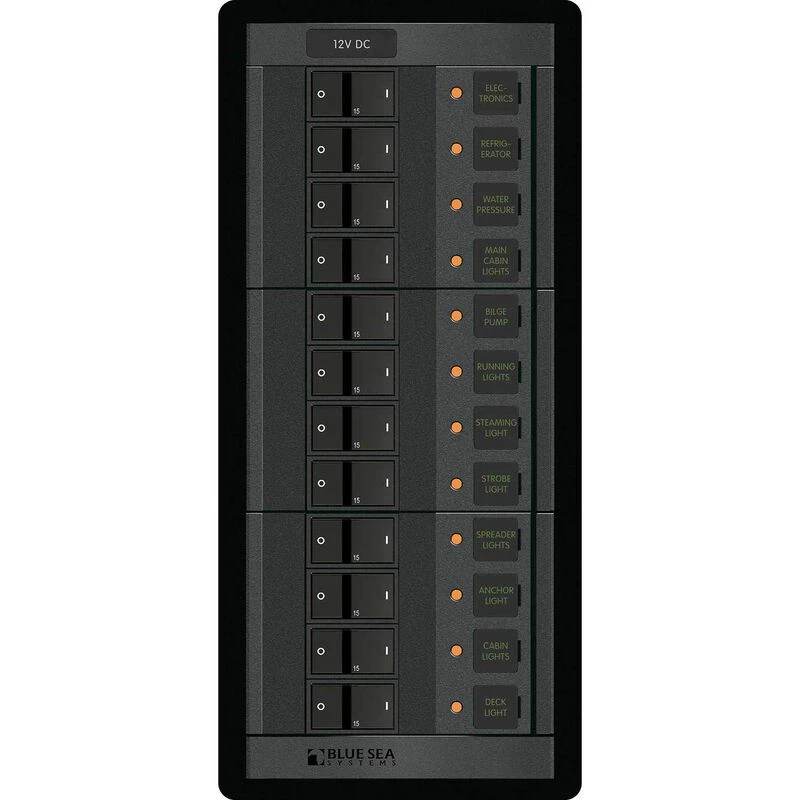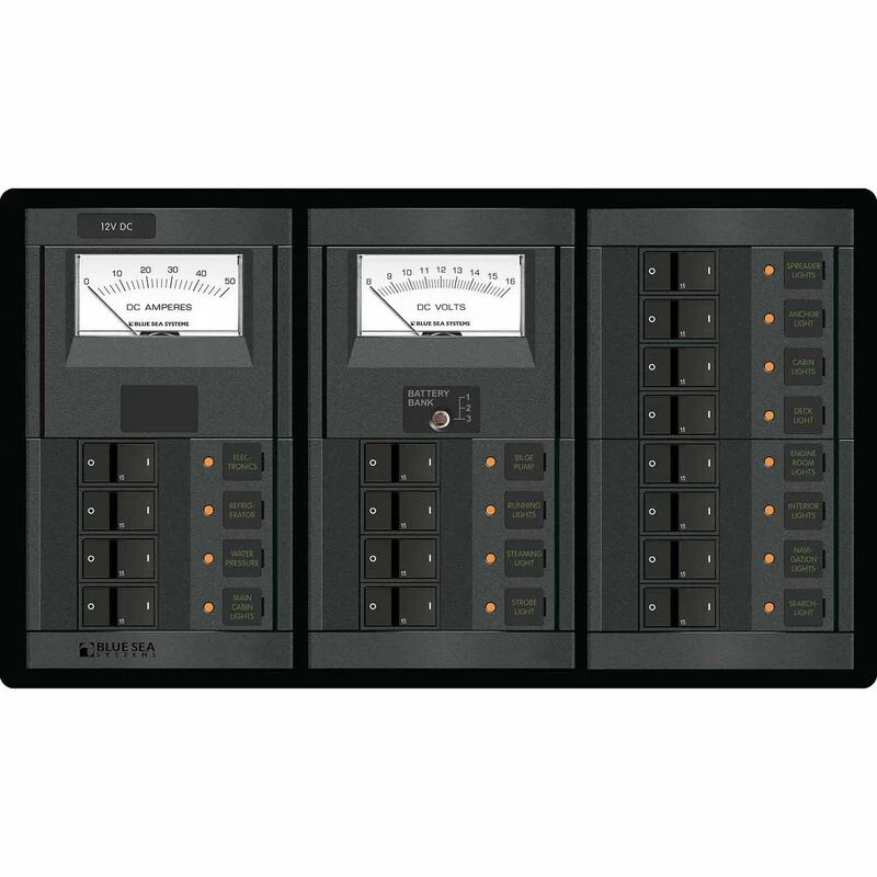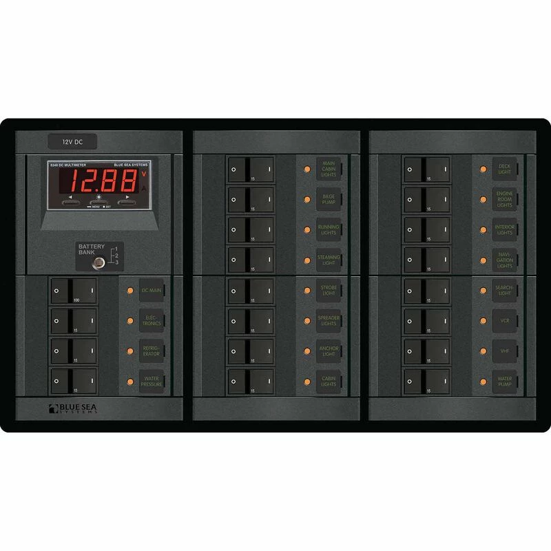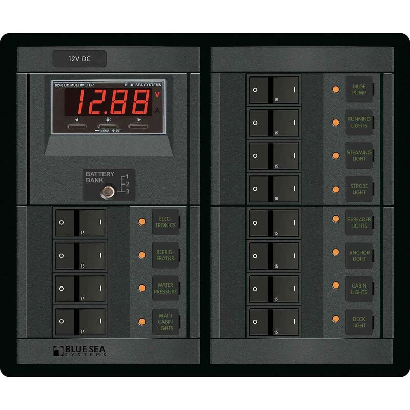 Blue Sea Systems also offers pre-configured 360 panels to meet the demands of common DC systems; because there are times a custom panel may not be ideal. Built on the same modular platform as the custom panels, these pre-assembled panels share the same features. Choose from 8, 12, 16, or 19 position panels depending on your application. 15A single pole flat rocker breakers are pre-installed and 30 Basic DC square labels are included with each panel. Many of the panels incorporate a digital multi-meter with alarm. The 16 position panel includes an analog volt meter and an analog ammeter. The 12 position (1223) and 8 position (1225) do not include a meter. This is a great way to adapt this modular technology to your boat and make future changes to the electrical system a breeze.