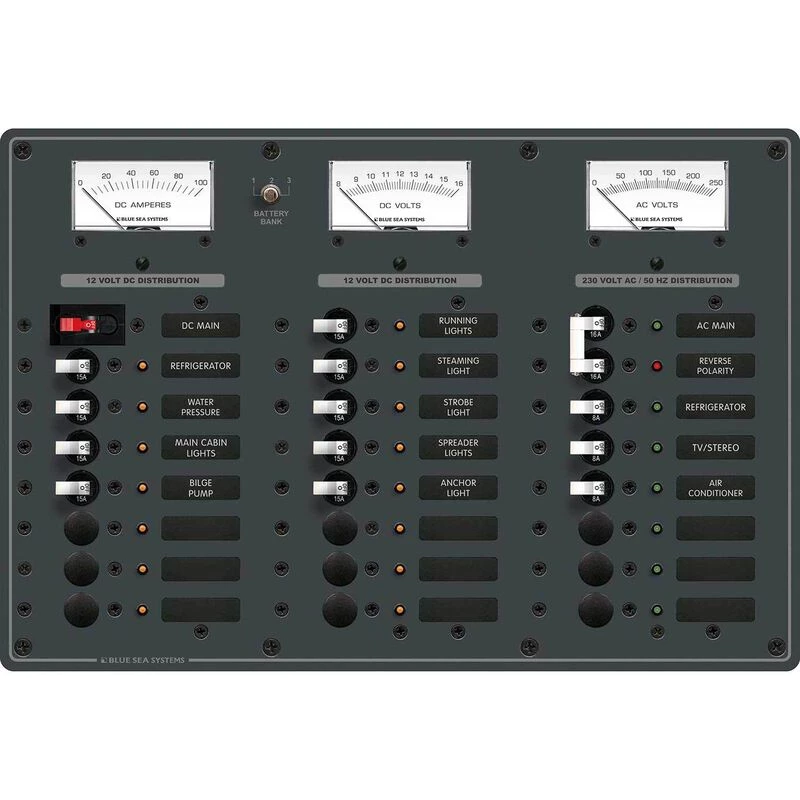 This panel is best suited for boats with average number of AC and DC circuits that will used in European waters. Set up to handle 230V service, it has an AC Main breaker with space for six AC branch circuits, plus a DC main with fifteen spaces for DC circuits. It comes pre-wired for easy installation with hot, neutral, and safety ground bus bars already installed. An A-Series double pole 16A AC main breaker and three A-series single pole 8A breakers handle the AC side of the panel and leave three open positions for customization or expansion. The DC side is controlled by a CA 1 100A Red IP main breaker and nine A-Series 15A branch breakers. There are six positions available for customization or expansion on the DC side. All breakers combine switching and circuit protection and are trip-free and cannot be held in the ON position when a fault is detected.