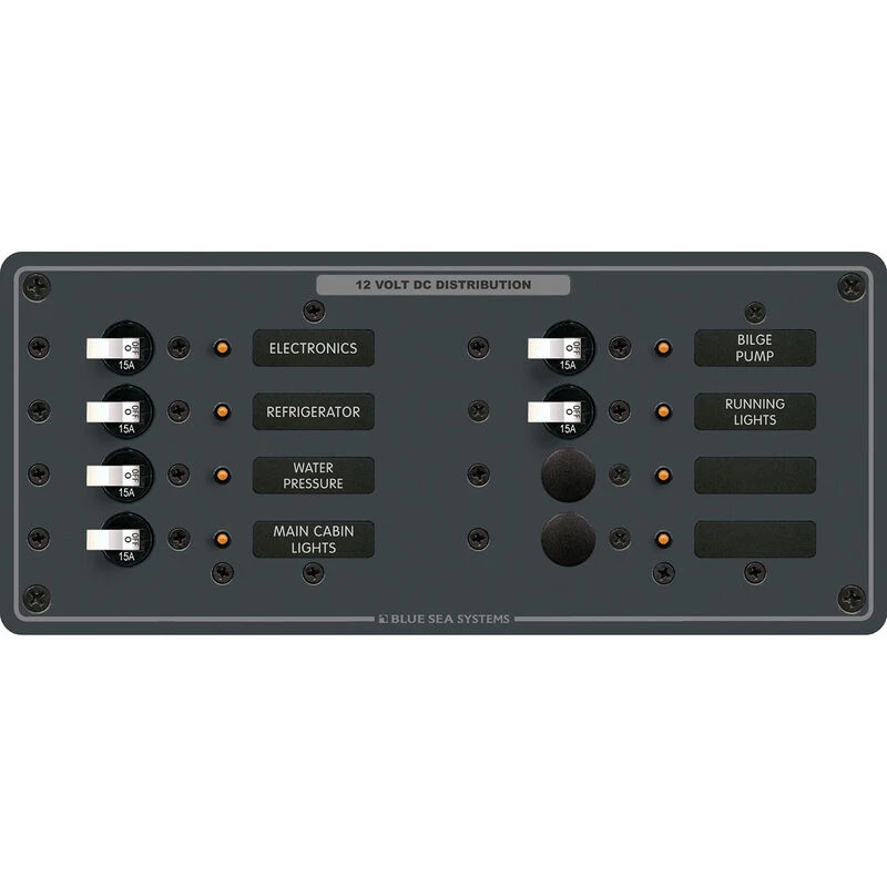 This DC panel comes pre-wired with positive, negative and grounding buses installed and provides a great way to manage your 12V or 24V DC system. Six 15A A-Series breakers fill some of the positions leaving room for customization or expansion. Blue Sea Systems breakers combine circuit protection and switching functions and offer trip-free feature that prevents the breaker from being held in the ON position when a fault is detected. Additional breakers (sold separately) can be installed or changed out to provide tailored circuit protection from 2.5A to 50A. LEDs that indicate that a switch is ON and large format backlit labels make using these panels in low or no light conditions easy. Each panel includes a label set of 30 commonly used DC labels.