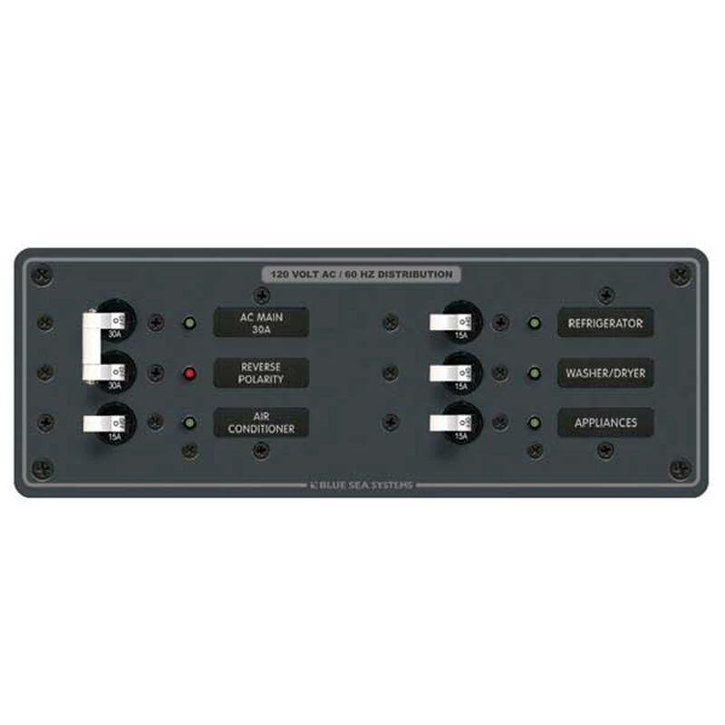 This panel is best suited for a boat with a smaller number of AC circuits and serves as an AC Main panel with space for four AC branch circuits. It comes pre-wired for easy installation with hot, neutral, and safety ground bus bars already installed. An A-Series double pole 30A AC main breaker and four 15A A-series breakers are pre-installed for AC branch circuits. All breakers combine switching and circuit protection and are trip-free and cannot be held in the ON position when a fault is detected. A red LED reverse polarity indicator light warns if polarity is switched. A green LED at all positions indicates switch is ON. Large format labels are backlit for visibility in low or no light conditions. 30 commonly used AC labels are included.