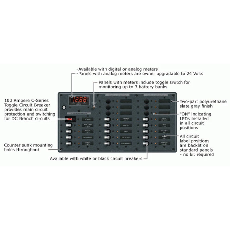Each of these DC panel comes pre-wired with positive, negative and grounding buses installed and provides a great way to manage your 12V or 24V DC system. A C-Series 100A single pole breaker serves as a DC main. 15A A-Series breakers fill some of the positions leaving room for customization or expansion. All breakers combine circuit protection and switching functions and offer trip-free feature that prevents the breaker from being held in the ON position when a fault is detected. A-Series breakers (sold separately) can be installed or changed out to provide tailored circuit protection from 2.5A to 50A. LEDs that indicate that a switch is ON and large format backlit labels make using these panels in low or no light conditions easy. Panels include digital multimeter or voltmeter and ammeter and provide users with a way to monitor up to three battery banks. Each panel includes a label set of 30 commonly used DC labels.