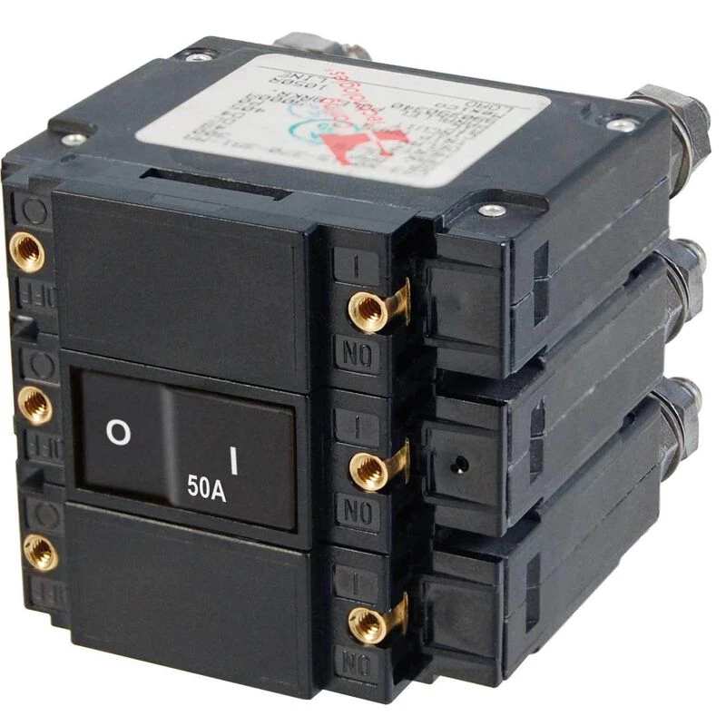 Electrical systems are unique to each boat and boater. With changes in the equipment and accessories a change is usually required at the breaker panel. The ability to accommodate these additions is one of Blue Sea Systems breaker panel’s qualities. 240V systems typically have two hot leads and a neutral. ABYC requires the leads including the neutral be protected. Blue Sea Systems makes this easy with these 3 pole breakers designed for use in 360 panels and SMS panel enclosures. Choose from 50A-300A protection to match the demands of the application. Hole patterns match for easy installation. This magnetic-hydraulic breaker has a trip free feature that prevents the switch from being held in the ON position when a fault is detected on any of the three poles. A colored actuator indicates when a switch is in the OFF position.