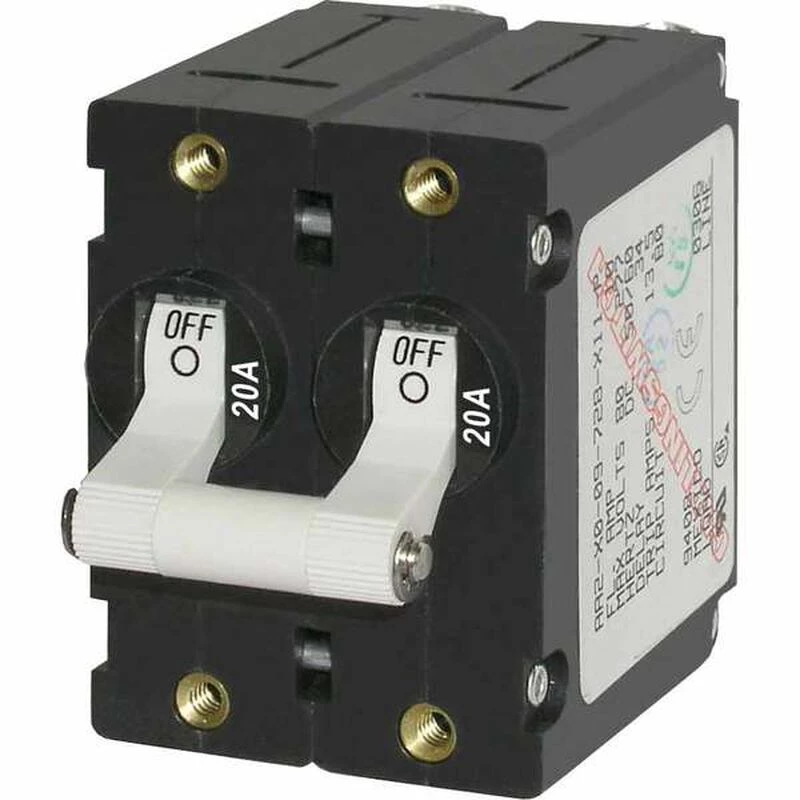 Rarely will a breaker panel come pre-installed with the exact circuit protection your system requires. Each electrical system is unique to the boat and the boat owner. It is inevitable that breakers will have to be changed to meet the demands of the existing or changing electrical loads. Blue Sea Systems makes it simple. The A-Series circuit breakers combine circuit protection and switching into a single toggle and are designed to fit Blue Sea Systems panels for a quick change to the correct protection. All A Series breakers are now CE marked and continue meet ABYC and USCG standards. These breakers are capable of handling short start-up current surges found in electric motors and other appliances without tripping. For added safety, a Trip-Free feature prevents the toggle from being held in the ON position when a fault is detected. These double pole breakers are available in 5A-50A protection ratings with white or black toggles; there will be one that will match your application and your breaker panel.