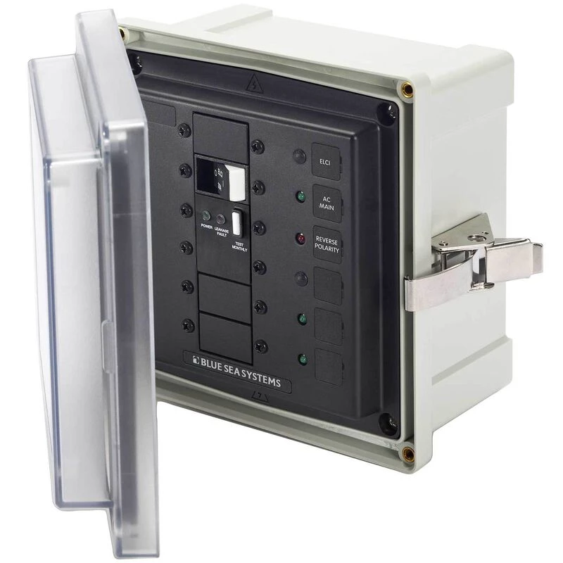 Equipment Leakage Circuit Interrupter (ELCI) panels protect not only everyone on your boat, but also those in the surrounding water from accidental electric shock caused by ground fault or faulty ground. Blue Sea Systems offers this complete panel with one pre-installed A-Series 50A ELCI main breaker (240V AC double pole) that will trip when either situation is detected. The water tight box is easy to install and features round knockout that are compatible with included enclosure glands and seal wires entering the box. A clear cover allows easy view of circuit breaker status by a Green LED indicating breaker is in ON position and a red LED alerts user to reverse polarity. Stainless steel latch and mounting hardware secures cover and creates a water tight seal. Installation of an ELCI panel meets ABYC E-11 when mounted within ten feet of AC shore power inlet.