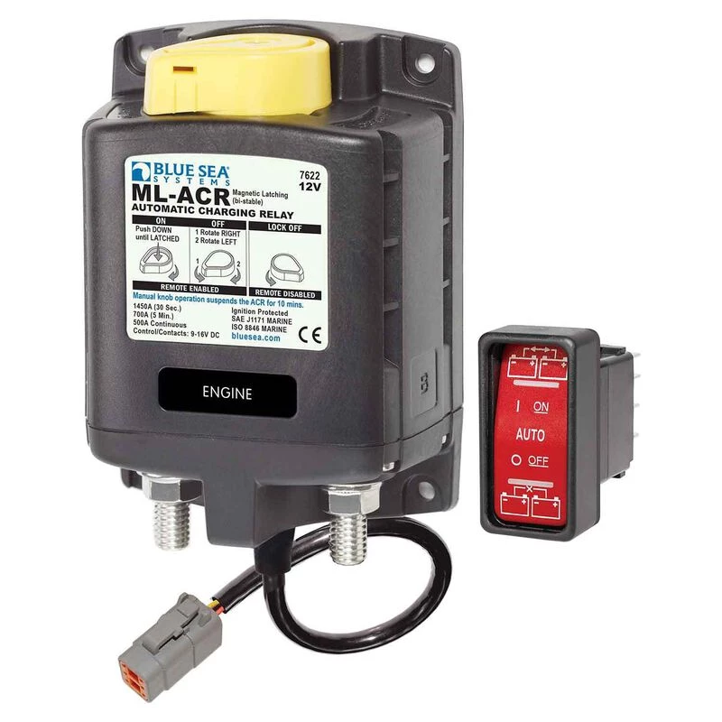 - 12V 500 amp ML ACR with Deutsch DTM cable end automatically combines batteries during charging and isolates batteries when discharging and when starting engine