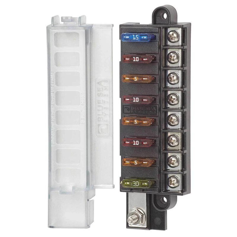 Fuse Blocks are an effective method of protection to prevent damage to wiring and possible fire in the event of an over-loaded or short circuit. This Blue Sea Systems space-saving fuse block can provide protection for new installations or when the panel has run out of breakers. Often used for electronic installations, these fuse blocks can be fed by one breaker from the distribution panel and supply power to 8 additional circuits. Terminals are located on one side to concentrate wiring and minimize the overall footprint of the fuse block. A clear cover insulates fuses and terminals from accidental contact and satisfy ABYC and USCG requirements.
