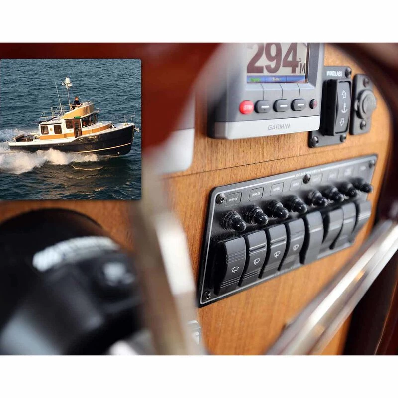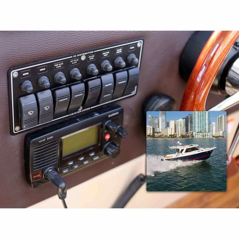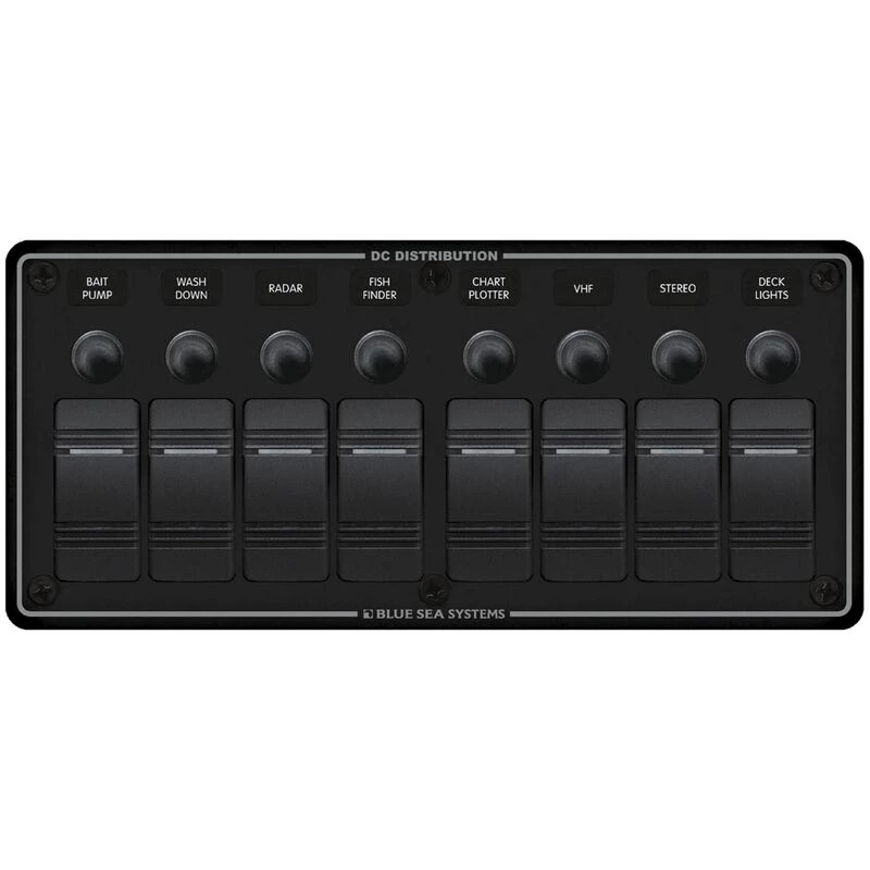 Blue Sea System water resistant panels are made to be exposed to the elements; including saltwater spray and washdowns. An included gasket seals the panel and protects areas behind the dash from water intrusion. These panels feature modern Contura rocker switches and look at home on almost any boat. LED lights behind each switch indicate it is ON. Each switch has a corresponding push-button 15A breaker that is protected by a waterproof boot These pre-wired panels are available in 3, 4, 6, and 8 position panels; there is one to fit, most applications and provide an extra switch for expansion. Included 60 label set makes organizing the switches a breeze.
