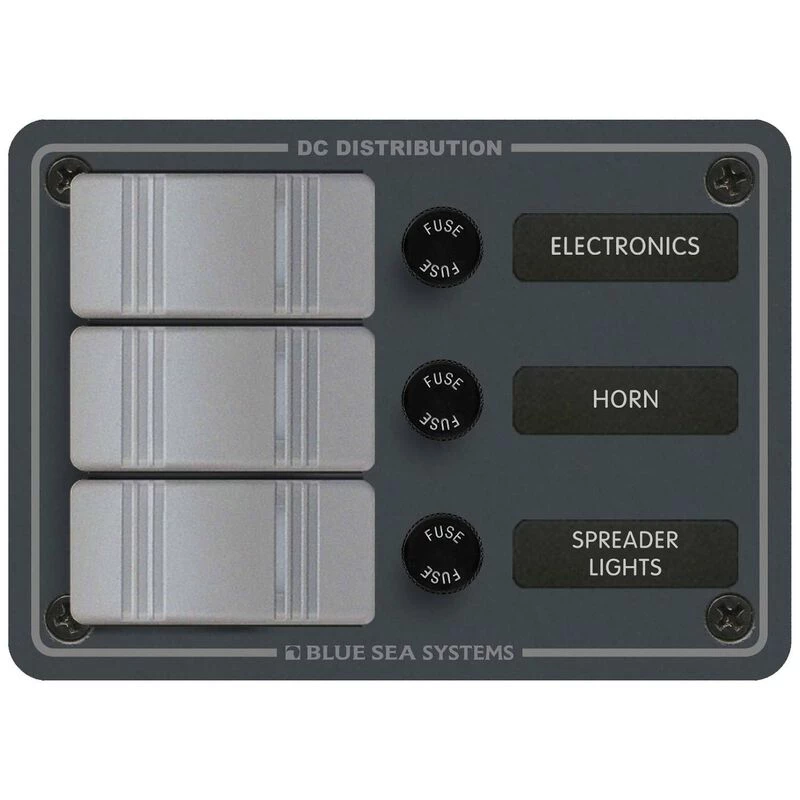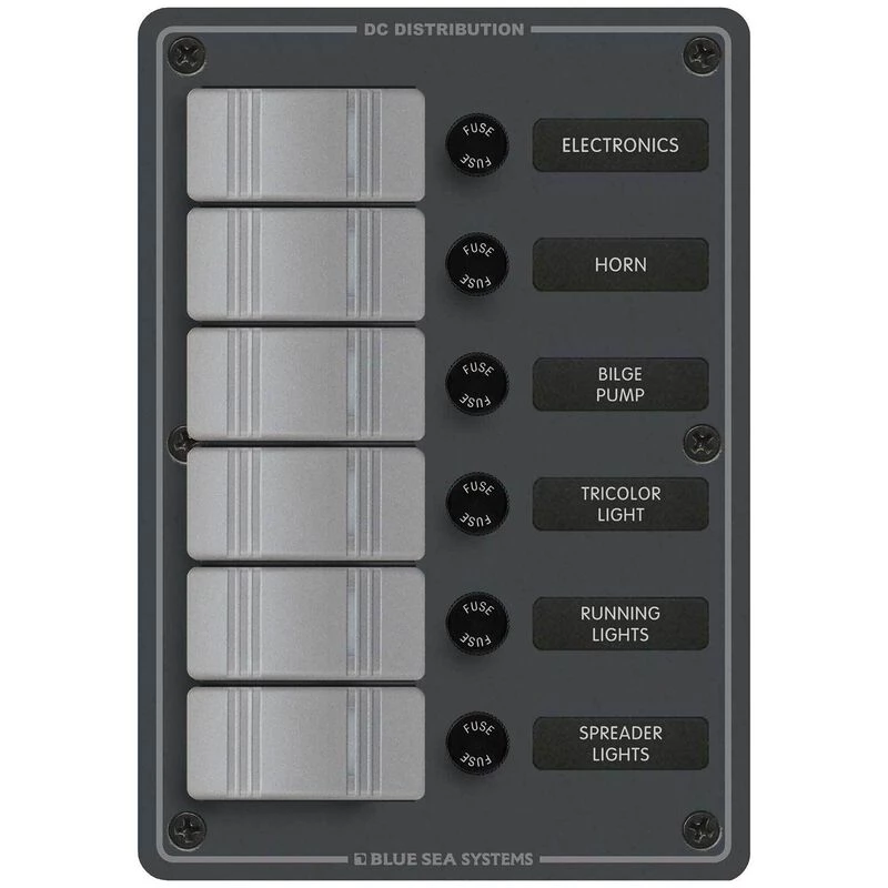 Blue Sea Systems water resistant panels are made to be exposed to the elements; including saltwater spray and washdowns. An included gasket seals the panel and protects areas behind the dash from water intrusion. These panels feature modern Contura rocker switches and look at home on almost any boat. LED lights behind each switch indicate it is ON. Each switch has a corresponding AGC (standard glass fuse) fuse that is easily accessible through a sealed cap. These pre-wired panels are available in 3, 4, 6, and 8 position panels; there is one to fit, most applications and provide an extra switch for expansion. Included 60 label set makes organizing the switches a breeze.