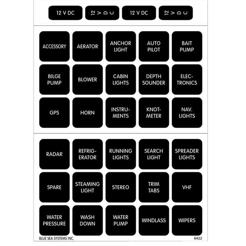 Blue Sea Systems square format labels are a great way to finish the installation of a new panel or update an existing panel to include any additions or changes. These durable weatherproof labels can be backlit (depending on the panel). This basic DC set includes 30 commonly used labels. See detailed lists below for included labels.