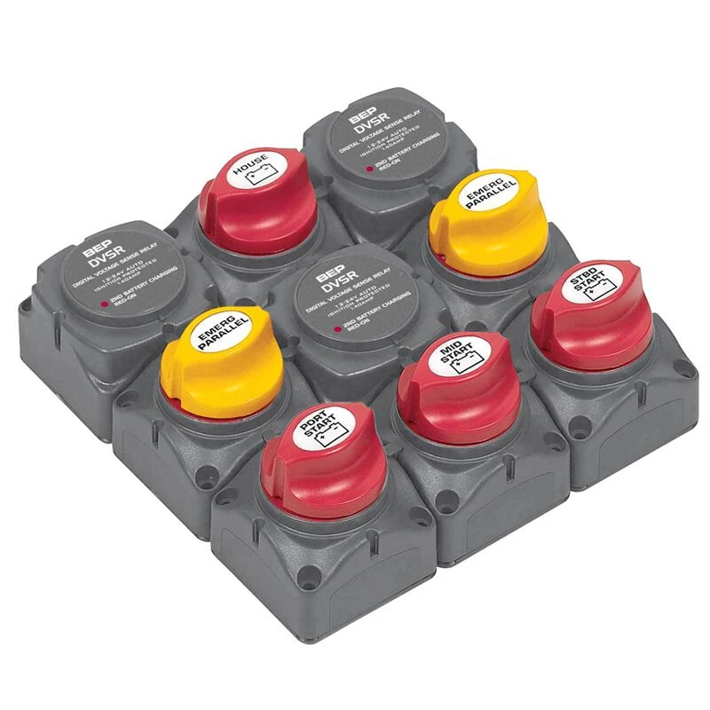 Dual battery charging made easy! The 719 battery distribution cluster is the optimum battery management system for your triple outboard engined boat. The 719-100A combines six of BEP’s 701 battery switches and three 710-125A Voltage Sensitive Relays (VSR).
