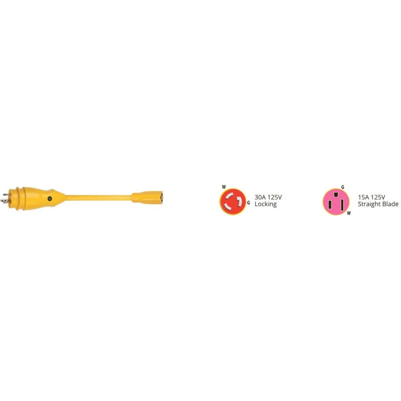 The EELâ„¢ pigtail adapter plug has the same ergonomic design as the EEL ShorePowerâ„¢ Cordsets and easy to grip. This pigtail converts 30A shore power service to 15A household plug for plugging in extension cords at the dock or campsite. LED power indicator light at the shore power end confirms that power is running through the cord. The length of cable from the plug allows a better range of movement and removes strain put on the connection between the extension cord and connector.