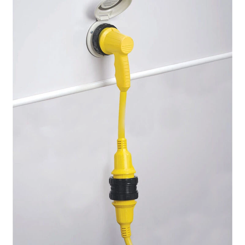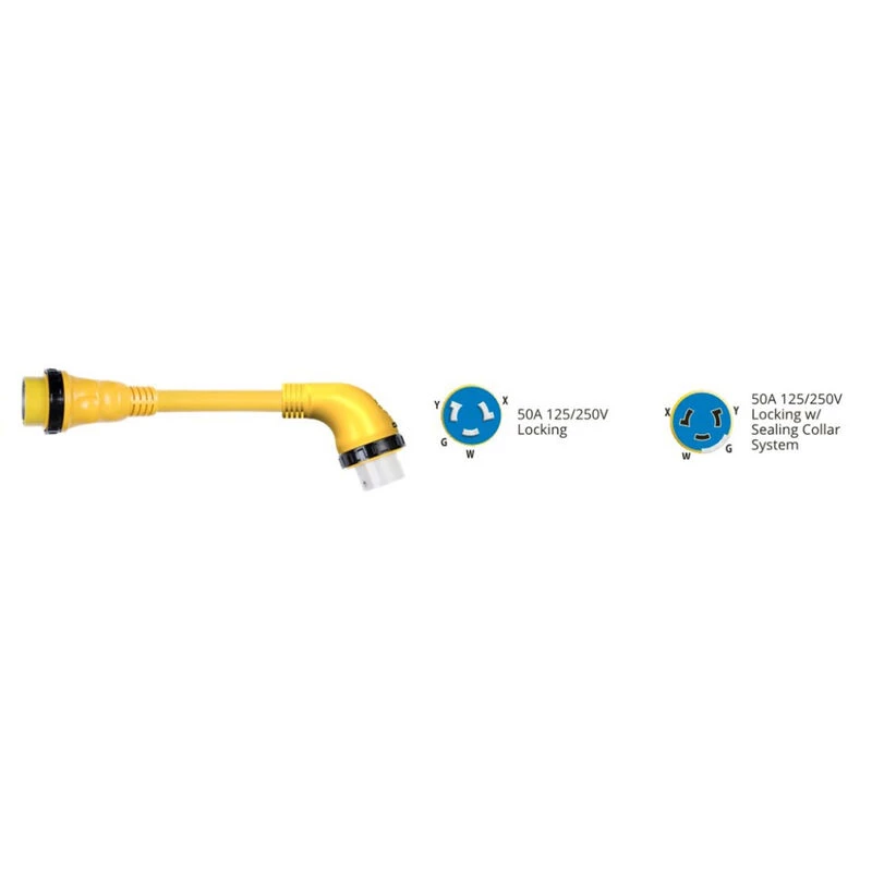 The MARINCO 50A Right-Angle Cord Set Adapter is used when space is tight, convert your existing shore power cordset from a straight connection to a right angle connection. GripLock handle design for easy hook-up and correct blade alignment, even in the dark. Includes sealing collar to lock out moisture between adapter and cordset.