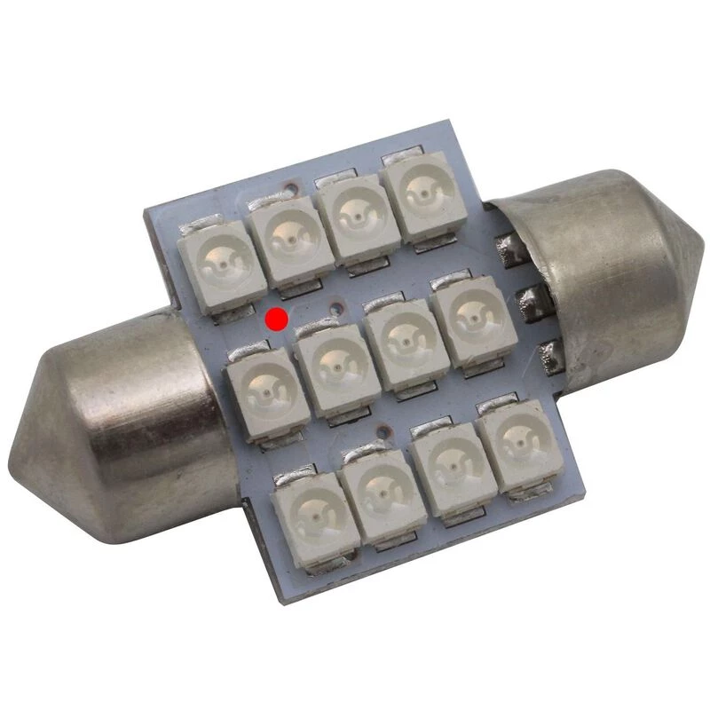This bulb replaces and has similar brightness to 1 to 3 watt Halogen/Filament Red Festoon bulbs. Fits many 30-33mm sockets which call for 1 1/8″ or 1 1/4″ bulbs. This is the short or stubby festoon in Red. 11-14VDC input range. White bulb cross reference #’s 3022, 3175 DE3022, 6428, DE3021, 7065, DE3175, DE3022LL, DE3021LL, DE3175LL. 55 max lumens, radiates to one side of the fixture.