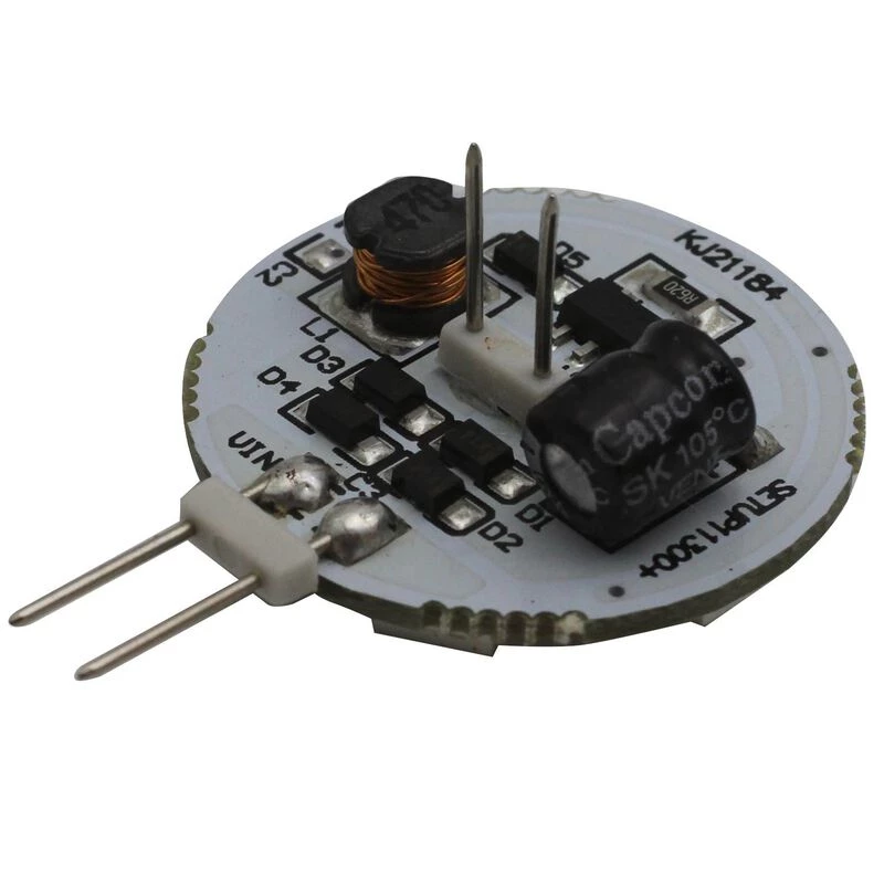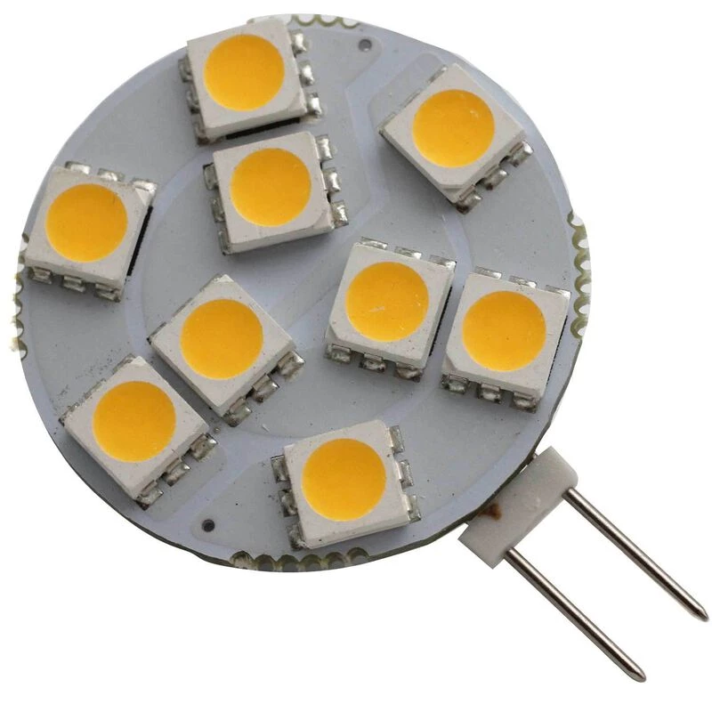 This bulb replaces G4 bulbs, and other LED disk modules with side pins. 10-30VDC input range constant power for 12 and 24 volt systems. 90 max lumens. Amperage draw will decrease as voltage is increased. Similar brightness to a 4 or 5 watt halogen G4. Commonly used in dome lights and reading lights. Low eye strain bright warm white output. Dimmable from 7.5-10V on 12V systems.