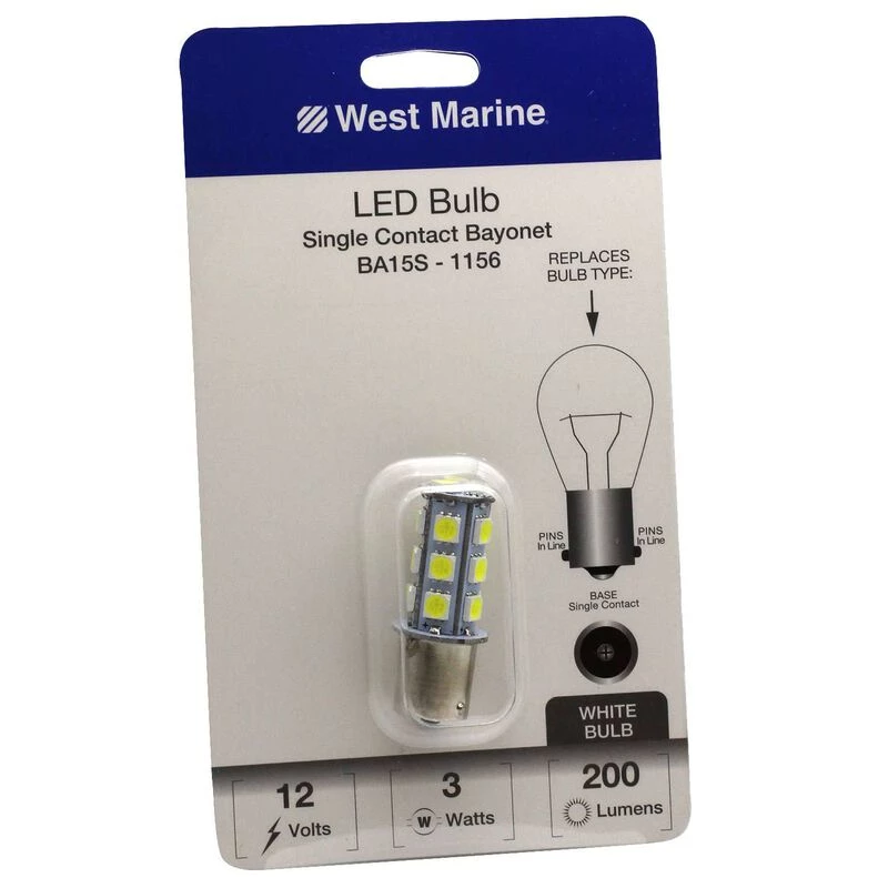 The WEST MARINE Single Contact Bayonet BA15S-1156 LED Bulb, 200 Max Lumens has been designed as a replacement and upgrade for standard halogen, Xenon and incandescent filament bulbs, offering dramatically lower power consumption and heat generation, while having much greater lifetime and shock resistance. For even greater light output and quality as well as higher efficiency (more light per watt) please look to our Premium series bulbs.