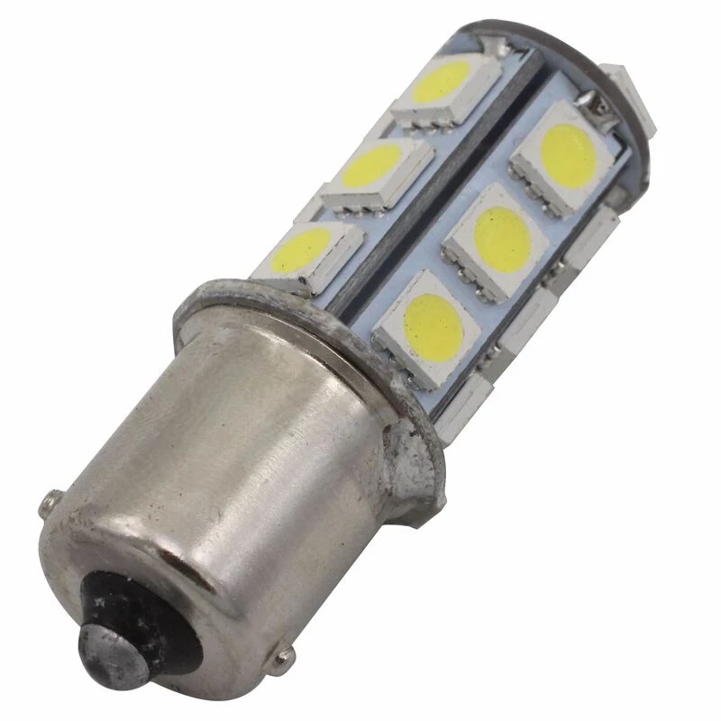This bulb replaces and has similar brightness to 10 and 15 watt traditional bulbs using the Tall/S8 globe. Cross reference #’s BA15S 1141, 2396, 1156, 67, 87, 12088, 1156NA, 97NA, 1095, 93, 97A, 1295NA, 97, 3497, 1073, 1295, 1195, 1156A, 7506, 199, 631, 1156ST, 1073LL, 1156LL, 7506L, 3497LL, 7506ST, 1156ALL, 97LL, 7506LL, 93LL, 631LL, 1141LL, 5008, 5007, 1155, 89, 57X, 105, 1003, 98, 1003LL, 67LL, 89LL, 105LL, 5008LL, 5007LL, 1155LL. Single contact on the base and in-line pins. 11-14VDC input range. 200 max lumens, radiates in all directions.